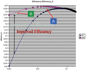 要实现真正的效率,并不仅仅意味着DC-DC转换器在负载指定的某个操作点可以获得多高的效率,而是在DC-DC转换器整个载荷范围内这种高效率能够维持多久。一般来说,大部分DC-DC转换器都指定可以达到的最大效率数字,而且人们也通过选择一个非常大的数字(如95%),毫不犹豫地选择一个合适的转换器。然而,要真正地充分利用这个效率,还需要把转换器的曲柄转到可以实现最大功率转换的操作点上。如果未转到这个点,就不能达到95%的效率。而且因为这个问题,根据所应用的载荷,有时甚至达不到60%的效率。